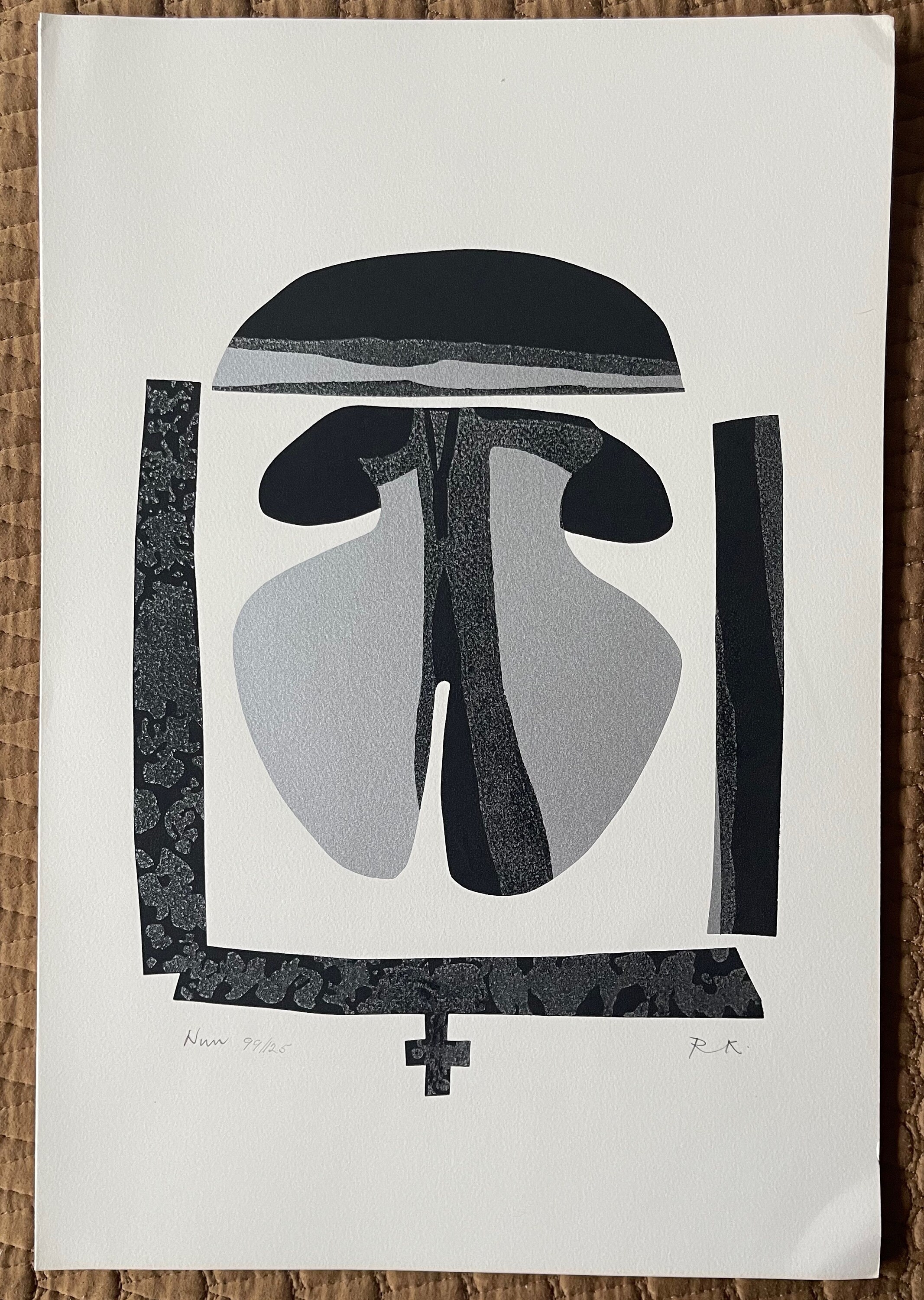 Item: For your consideration we are presenting for sale a rare vintage limited edition abstract silkscreen print by artist, Ronald King. It was issued as a Prologue to the Canterbury Tales (Alecto Press, 1967). It is done on a quality heavy paper. It is titled "Nun", numbered (99/125), and initialed "R.K." by the artist in graphite along the lower edge border of the print. The reverse side of the paper is stamped "EA446" (see photo). Will look fantastic framed in any modern interior setting!