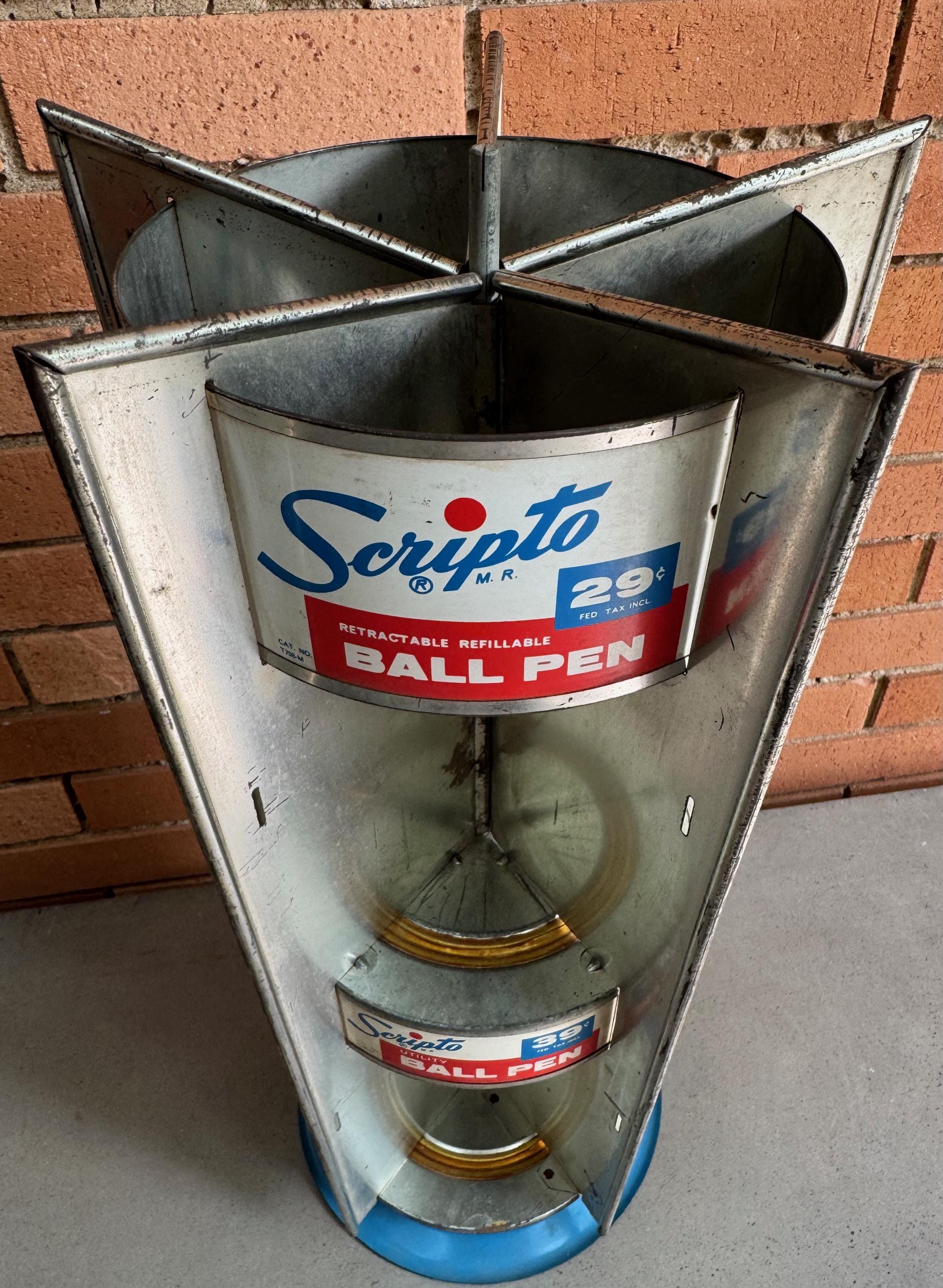 ITEM: For your consideration we are presenting for sale a vintage SCRIPTO store display / advertising stand. Materials: Metal. The display rotates at the base. The stand is divided into ten (10) wedge-shaped compartments, and each compartment was used to hold pens / pencils.